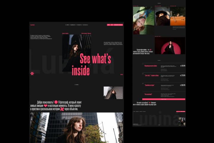 Создан визуально цельный проект, где тёмный фон и яркие акценты подчёркивают глубину образов. Проект не просто сайт-портфолио, а визуальный дневник, который передаёт мироощущение автора. На сайте можно не только посмотреть работы, но и почувствовать фотографа как человека.