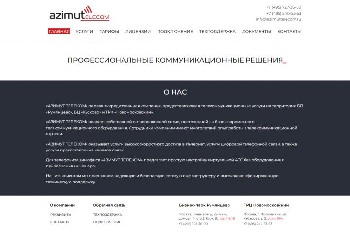 Сайт телекоммуникационной компании. Используется Wordpress как основа сайта. Дизайн, CSS, Разметка, JavaScript разработаны строго для данного проекта.