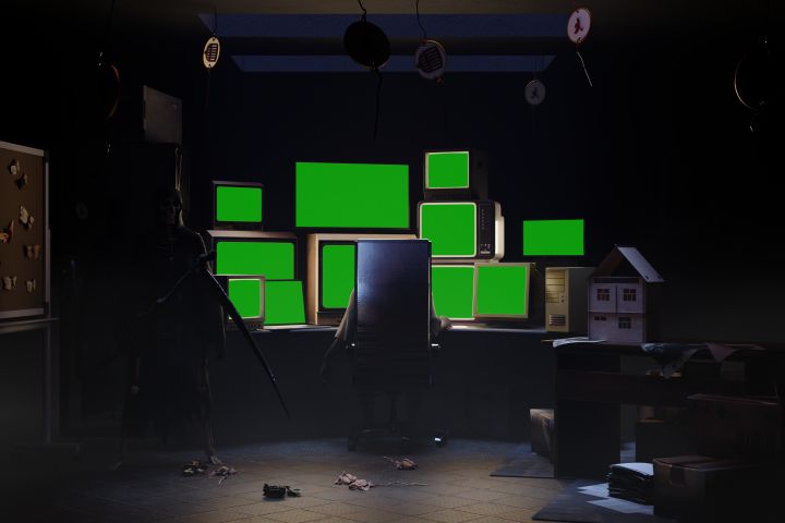 В комнате посередине стоит стул, за которым сидит наблюдатель. Перед ним множество экранов (новых и старых мониторов, плоских и старых телевизоров), просто зеленые экраны для добавления хромакея через которые он следит за героями. На полу рядом лежит множество вялых роз, на стене коллекция с прибитыми спицами бабочками, на столе рядом с телевизорами стоит домик Алены, откуда-то сверху свисают бумажные игрушки-круги (из линии с Аленой), на столике рядом с Наблюдателем лежат листочки с рисунками и карандаш.