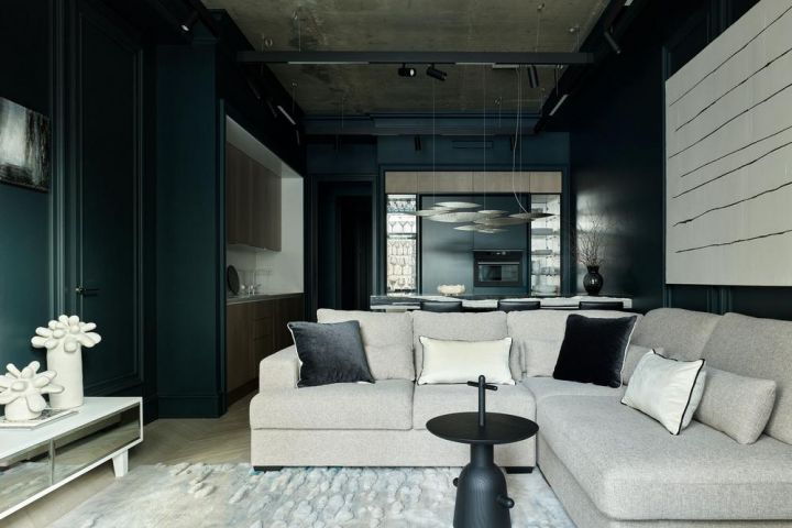 Гостиная выполнена в цвете морской волны, который словно надвигается от окна и заполняет все пространство. Такого эффекта удалось добиться с помощью ковра с яркими лазурными «мазками», напоминающими морской прибой. Главным акцентом и первым купленным для проекта предметом стала картина Кирилла Басалаева из серии «Приобретенная беспомощность». Большое белое полотно на почти черной стене «разрывает» пространство, как дополнительное окно.