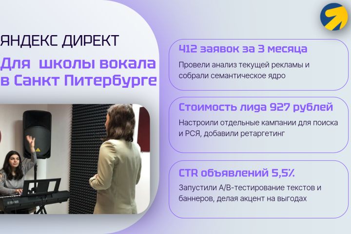 Сбор ключевых слов. Подготовили семантическое ядро из 1100 фраз, включая низкочастотные запросы вроде "уроки вокала для начинающих СПб". Такой подход снизил конкуренцию и стоимость кликов.