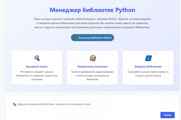 Была поставлена задача создать аналог "Pypi" "npm", без знаний Java Script и Django, работа выполнялась командой, также с использованием ИИ. Программа включает в себя сайт с простым и понятным дизайном, а также приложение, которое можно использовать для установки библиотек Python в Venv.
