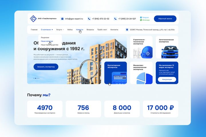 Дизайн сайта для компании в сфере экспертизыКомпании, предоставляющей услуги экспертизы, требовался современный и респектабельный сайт, который мог бы наглядно презентовать сложные услуги и преобразовать интерес посетителей в заявки. Ключевая задача — создать информационно насыщенный ресурс с упором на доверие и профессионализм, оснастив его инструментами для генерации лидов.