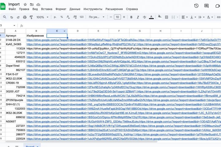 Мы подготовили файл импорта товаров для МойСклад, включающий около 36 000 изображений, размещённых на Google Drive. Для автоматизации процесса была реализована Google Apps Script-автоматизация, которая обходит структуру папок, извлекает ссылки на изображения и сопоставляет их с артикулами товаров. Сформированный CSV-файл с колонками "Артикул" и "Изображение" был адаптирован под формат импорта МойСклада, где каждая строка соответствует товару и содержит публичную ссылку на соответствующее изображение.