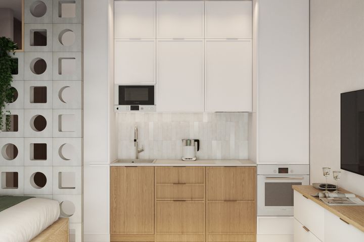 Кухня в студии в стиле Джапанди. Задачей было сделать удобно и соборно пространство 25 м.кв