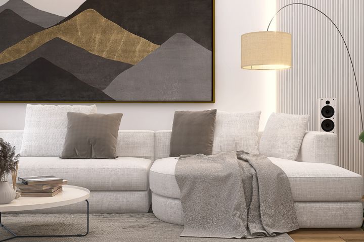 Передо мной стояла задача спроектировать светлую, просторную и функциональную гостиную в современном минималистичном стиле. Основные пожелания клиента — интерьер в белых тонах, наличие домашнего кинотеатра, стильный бар, а также максимальная чистота визуального восприятия и эргономика.