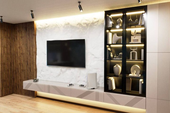 Были объединены зоны кухни и гостиной для визуального увеличения пространства, но сохранено зонирование с помощью стеллажа для хранения и реечных перегородок. В ТВ-зону включена гипсовая панель «скала», которая подчеркнула твердость характера владельца данной квартиры.