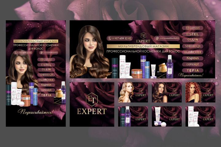 Магазин «ЭКСПЕРТ» (Профессиональная косметика для волос Чебоксары) – это мультибрендовый магазин, предлагающий широкий ассортимент профессиональной косметики для волос от ведущих брендов, таких как ESTEL, OLLIN, MONEQI, OLORCHEE, Kapous, Concept, TEFIA. Задача заключалась в создании яркого и запоминающегося дизайна социальных сетей, который отличается разнообразием ассортимента, высоким качеством продукции и привлекает целевую аудиторию – профессиональных стилистов и тех, кто заботится о здоровье и красоте своих волос.