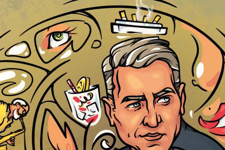 Решением задачи было изображение автора, который берётся за микрофон, только-только отходя от рассеянных воспоминаний, что на фоне представляются калейдоскопом отрывочных кадров и историй, воронкой уходящих во вчерашний день.