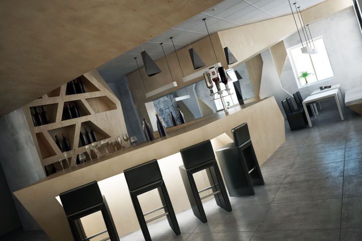 Создать дизайн-проект кафе-бара, включающего в себя многообразие функций- это одновременно место отдыха, досуга, вечеринок и место приема пищи. Учесть небольшой бюджет проекта, при этом сделать пространство динамичным. Предусмотрено много барных стоек и обеденных столиков.