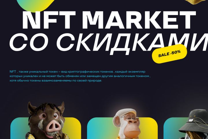 Задача заключалась в том что надо было разработать дизайн сайта NFT MARKET по шаблону.