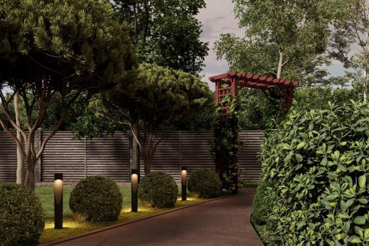 Пространство организовано с помощью пергол, живых изгородей и декоративных деревьев, создающих приватность и комфорт.