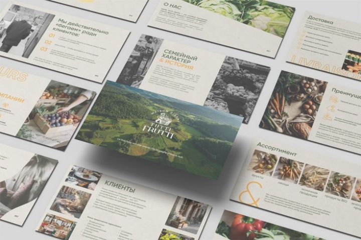 Нужно создать яркую и информативную презентацию для компании по поставке свежих овощей и фруктов во Франции, которая подчеркнёт качество продукции, надёжность логистики и преимущества работы с компанией. Материал должен быть визуально привлекательным, с сочными фото и лаконичным текстом, подходящим для клиентов и партнёров.