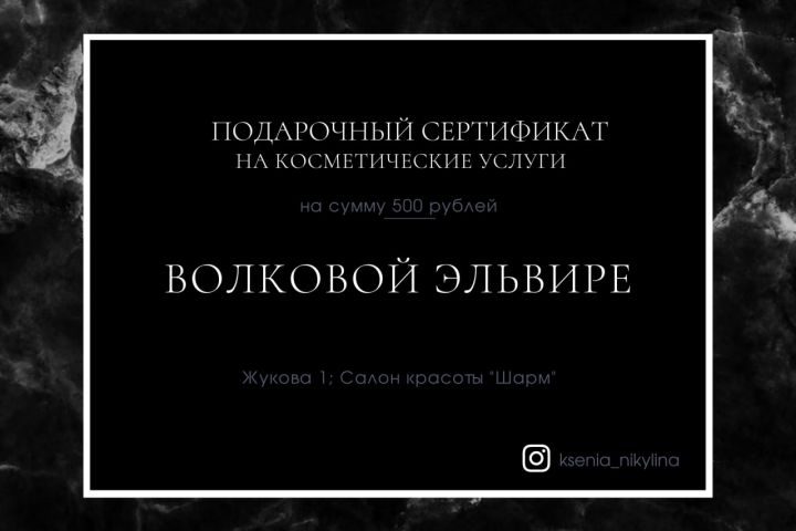 Клиент попросил сертификат на тёмном фоне, чтобы это отражало некую "сексуальность" и "женственность". Мраморный фон шикарно дополнил общую картину.