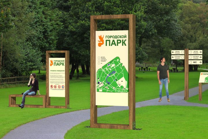 Дизайн разработан с учетом простых форм, не сложным в изготовлении. Информация напечатана полноцветной печатью на композите, объемные элементы выделены логотипом и названием парка. Средний указатель разработан с местом для отдыха. Дерево с дополнительной обработкой и пропиткой. Цветовая гамма композитных панелей светлая. Размеры указателей: стелла 1200х3000х300 мм, средний 2500х2200х450 мм, столб 1400х2200х160 мм, малый 900х1200х500 мм.