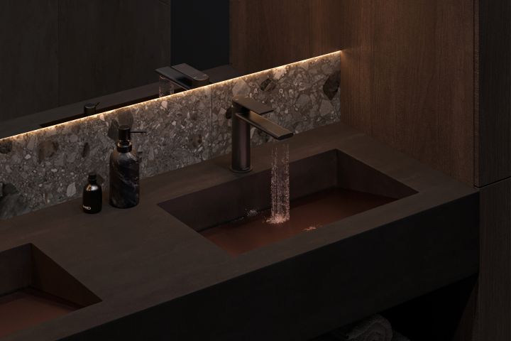Лаконичные черные подвесы над раковинами и скрытые ниши с подсветкой в душевой зоне излучают теплый приятный свет. Этот контраст — ключ к уюту, смягчающему мощь черного цвета и фактурного бетона, превращая пространство в обволакивающее и уютное.