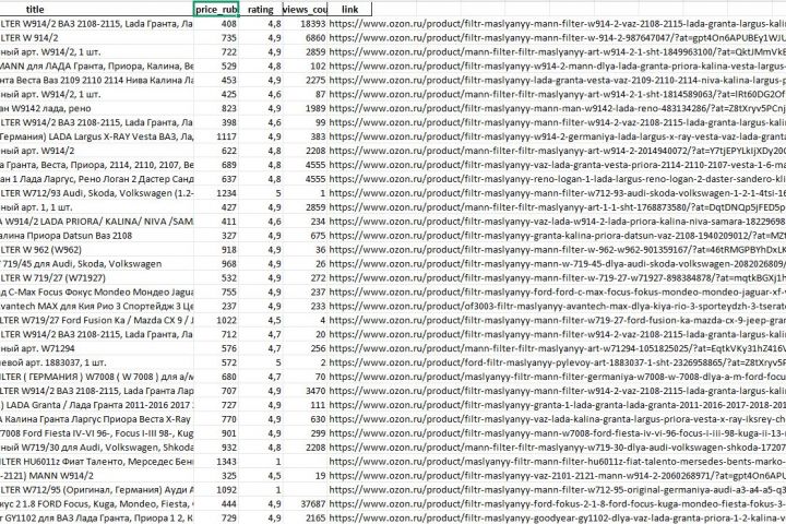 На выходе клиент получает структурированные таблицы Excel с ключевыми данными по товарам;