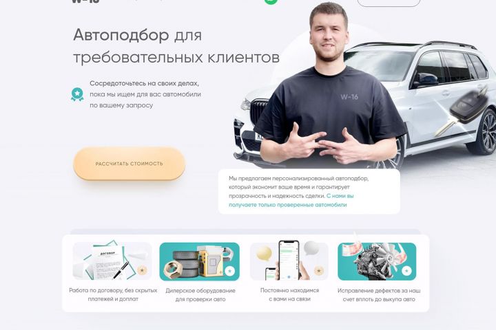 Разработать продающий одностраничный сайт для услуги профессионального автоподбора, который будет эффективно конвертировать посетителей в клиентов за счет современного минималистичного дизайна, четкого изложения преимуществ сервиса, демонстрации успешных кейсов и убедительных гарантий, с акцентом на экспертность и безопасность сделки для целевой аудитории — частных покупателей автомобилей.
