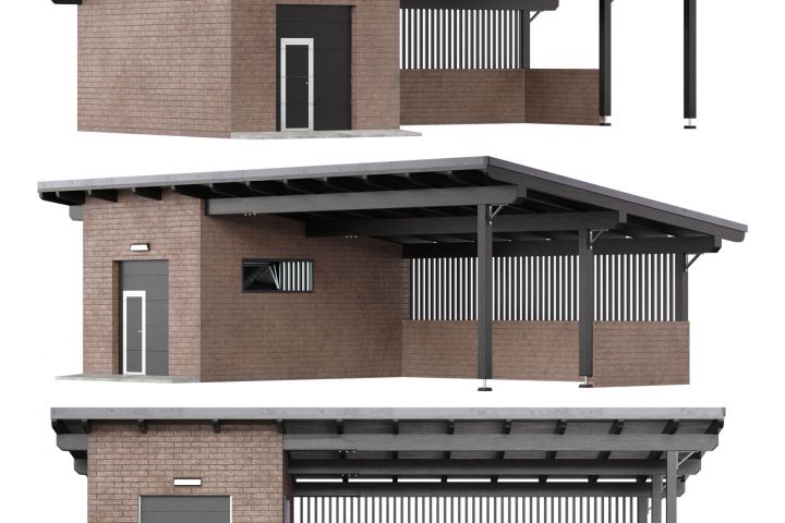 Модель представляет собой современный навес для двух автомобилей с встроенным хозяйственным блоком. Конструкция выполнена из кирпича, что придает ей прочность и эстетичный внешний вид. Навес имеет прочную крышу с металлическими опорами и вертикальными перекладинами, обеспечивающими защиту автомобилей от погодных условий. Хозблок оснащен дверью и окном, что делает его удобным для хранения инструментов или садового инвентаря. Идеально подходит для ландшафтного дизайна, архитектурных проектов или визуализаций загородных домов.