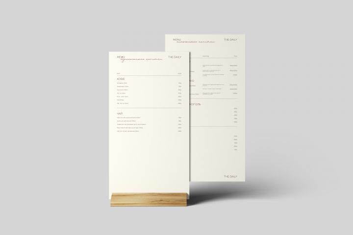 Ресторан "The Daily" – заведение с акцентом на здоровую, современную кухню и стильную, непринужденную атмосферу. Клиент обратился с задачей создать меню, которое бы отражало концепцию ресторана: минимализм, элегантность, свежесть и акцент на качественные ингредиенты. Меню должно было быть визуально привлекательным, легким в навигации и соответствовать общей стилистике бренда "The Daily".