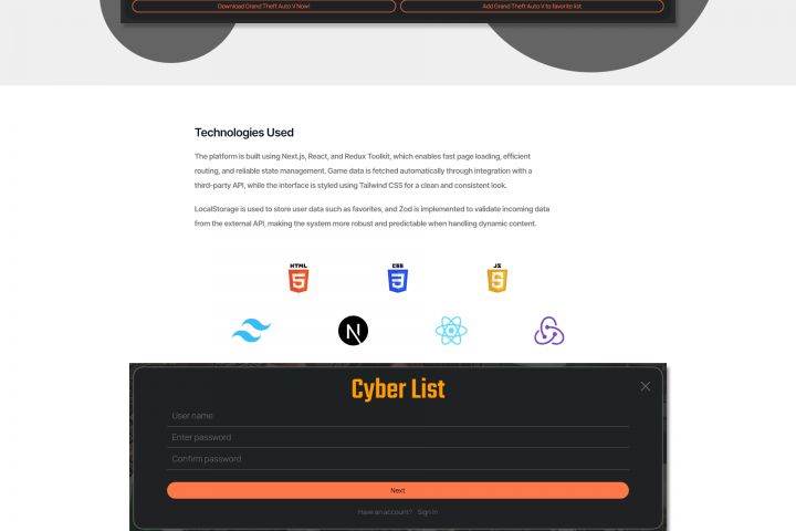 CyberList является платформой для геймеров, где можно просматривать страницы игр, отслеживать достижения, читать описания, отзывы и просматривать скриншоты. Проект построен с использованием Next.js и интегрирован с внешним API, что позволяет динамически получать данные об играх, рейтингах и активности.