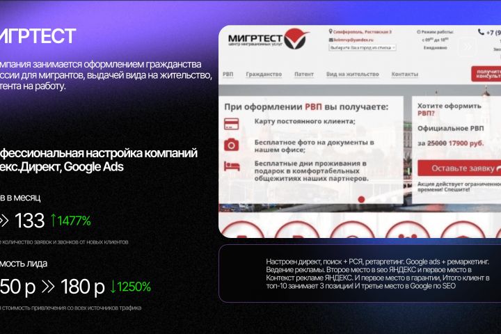 Компания специализировалась на помощи мигрантам в получении гражданства, РВП, ВНЖ и патентов. Основная задача — увеличить количество обращений и сделать рекламу эффективной, так как лиды обходились слишком дорого.