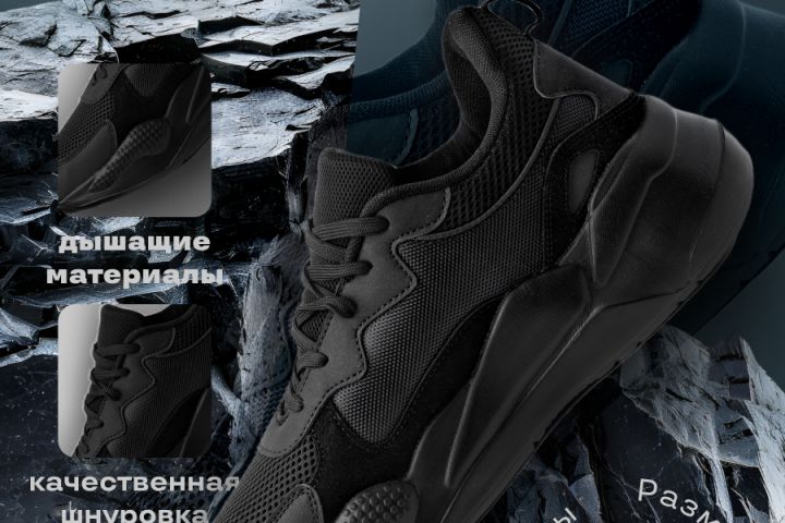 В качестве задачи, необходимо было создать впечатляющий главный экран для карточки товара "кроссовки мужские". 2 карточки для кроссовок массивного типа, и одни для кроссовок на плоском ходу. Требовалось выделить товары при помощи цветовых сочетаний