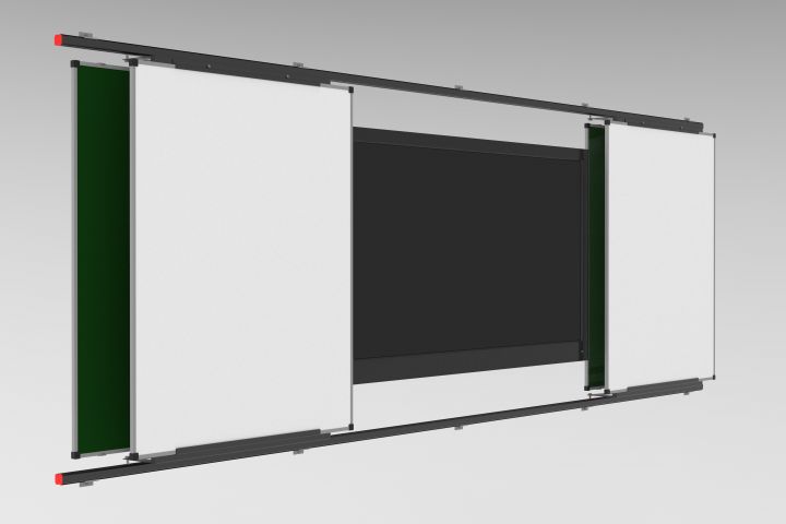 Подвижная рельсовая система на роликовых направляющих позволяет перемещать доски в горизонтальной плоскости, увеличивая поверхность рабочего пространства аудитории,