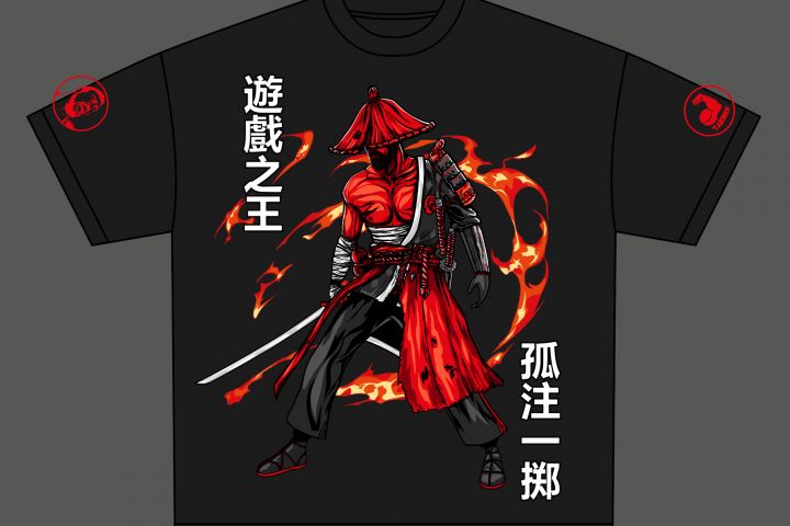 Самурая отрисовала по фотографии Дана в образе самурая, коня сгенерировала в ИИ, далее согласовала все дизайны с заказчиком и отрисовала в векторе (Adobe Illustrator) для печати DTF