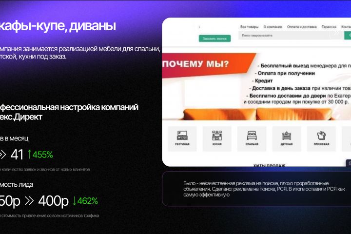 Мебельная компания продавала шкафы и диваны на заказ, но реклама была настроена некачественно и не приносила стабильных заявок. Важно было увеличить поток клиентов и при этом сократить стоимость лида.