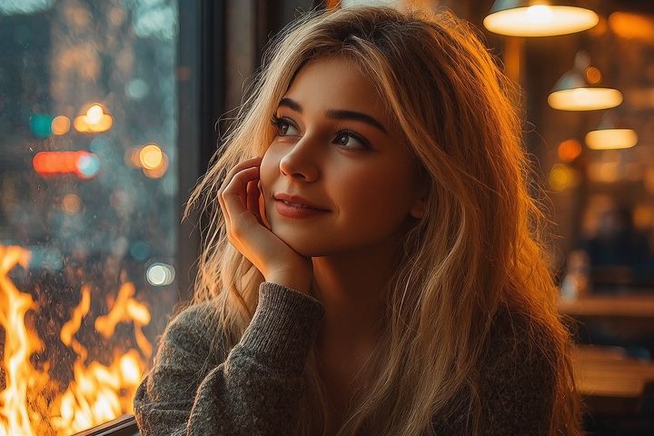 Сначала было наложено фото девушки на кафе потом сделано окно и стол и через ИИ объединено в общи кадр.