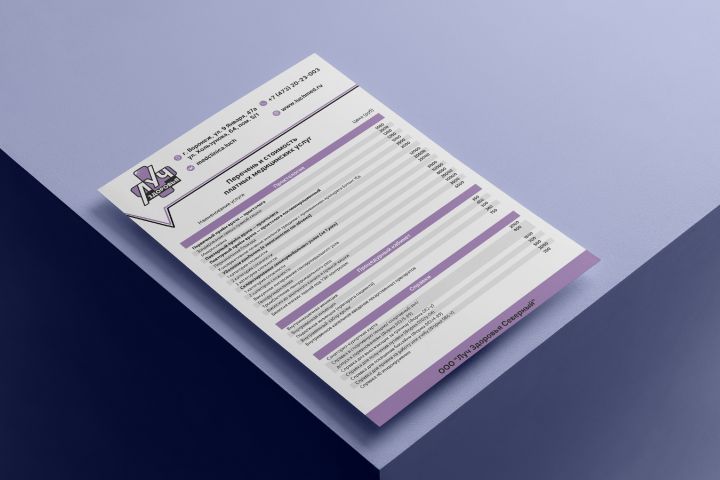 Дизайн выполнен в светлых тонах с использованием фиолетовых элементов, что придает ему современный и профессиональный вид. В верхней части прайс-листа указаны контактные данные клиники