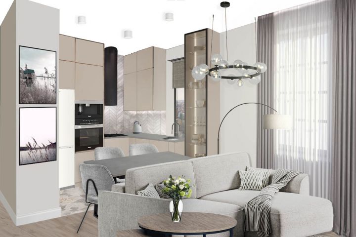В квартире 60 кв.м. размещается кухня-гостиная, спальня, детская, два санузла, гардеробная и лоджия. В семье растут два разнополых ребенка с большой разницей в возрасте. Задача была, не делая перепланировку, предложить удобное для всей семьи планировочное решение, сделать визуализации и чертежи по электрике