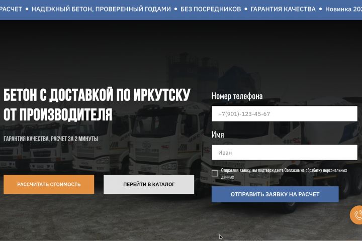 Клиент — небольшая компания по доставке бетона. Задача заключалась в том, чтобы упростить клиентам расчёт стоимости и времени доставки, а также повысить доверие за счёт современного дизайна. Основной акцент — удобный калькулятор и адаптивный интерфейс, чтобы заявки можно было оставлять с телефона.