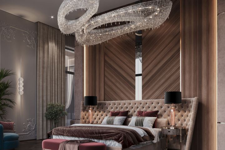 Этот проект мастер-спальни с гардеробной и зонами отдыха является частью проекта загородного дома для которого разрабатывался дизайн главного пространства кухни-гостиной с прилегающими помещениями. Данный проект - пример того, как можно объединить эстетическую выразительность и функциональность в интерьере высокого класса.