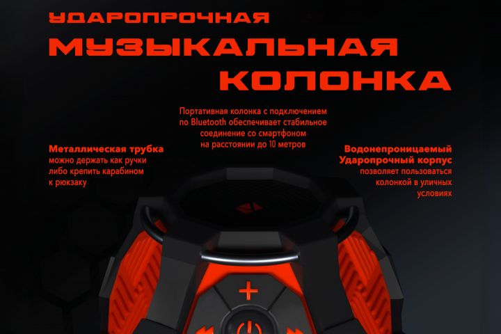 Финальным этапом стала подготовка постера, который демонстрирует концепт в виде законченного продукта. На нём отражены ключевые преимущества колонки: устойчивое Bluetooth-подключение, водонепроницаемый и ударопрочный корпус, металлическая трубка для переноски или крепления, а также удобные кнопки управления.
