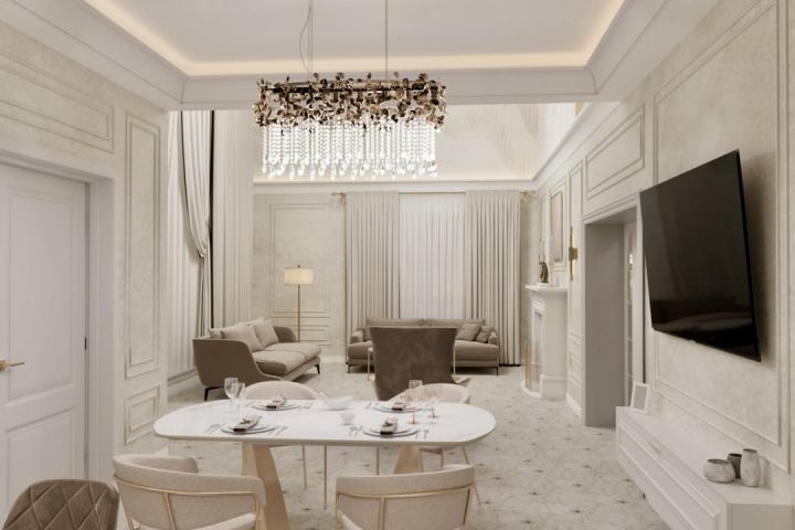 Было необходимо разработать концепцию, подобрать отделочные материалы и мебель, а так же разработать план электрики, потолков, сантехники и возводимых перегородок в частном доме в стиле неоклассика.