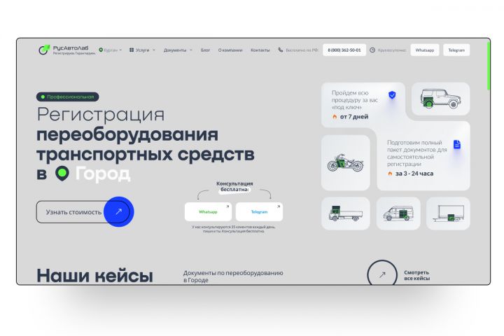 🚀 Клиент поставил задачу разработать сайт для компании РусАвтоЛаб, специализирующейся на переоборудовании транспортных средств с регистрацией в ГАИ. Основной целью было создать современный ресурс, который одновременно выполняет роль каталога услуг, базы знаний (блог и кейсы), а также мощного инструмента лидогенерации.