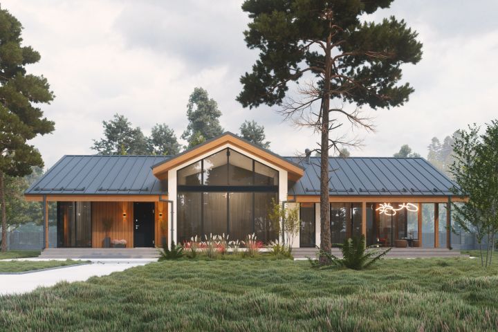 Эстетичный, комфортный и функциональный дом для жизни семьи. Объединить традиционный элемент — скатную кровлю — с актуальной архитектурной концепцией, где главную роль играет свет и вид за окном. Пространство должно быть грамотно зонировано, обеспечивая уединение в приватной спальной зоне и простор для совместного времяпровождения