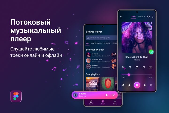 Дизайн приложения под Android. Приложение позволяет скачивать и слушать музыку как онлайн так и офлайн.