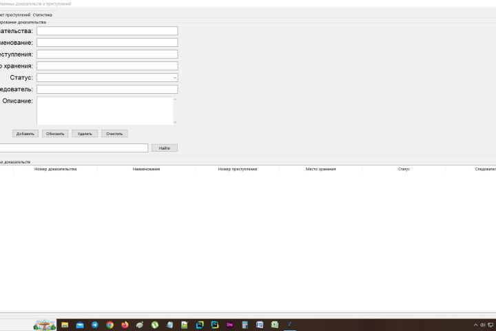 Это десктоп-приложение, которое позволяет эффективно отслеживать и управлять вещественными доказательствами и информацией о преступлениях. Приложение разработано с использованием Python, библиотеки Tkinter для создания графического интерфейса и SQLite для хранения данных.