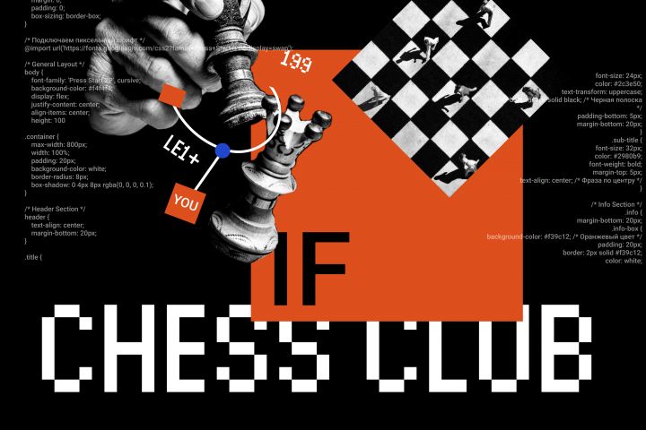 Решение: с помощью метафоричного дизайна было решено сопоставить две сложные системы, которые позволяют людям мыслить шире. Речь идет о шахматной стратегической игре и языке программирования. В визуализации были подобраны шрифтовые пары, отражающие данные стилистики, диджтл-арт, пиксельные графические элементы и яркая цветовая палитра.