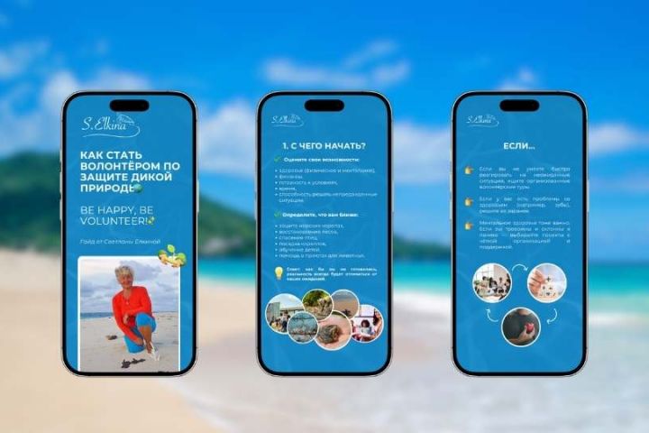 Решение заключалось в создании визуально привлекательного гайда: использованы современные 3D-иконки, морской фон, ассоциирующийся с природой и экологией, а также аккуратно оформленные блоки с ключевыми пунктами. Такой дизайн сделал материал ярким, лёгким для восприятия и вдохновляющим, подчёркивая ценность волонтёрской деятельности и побуждая читателя к действию.