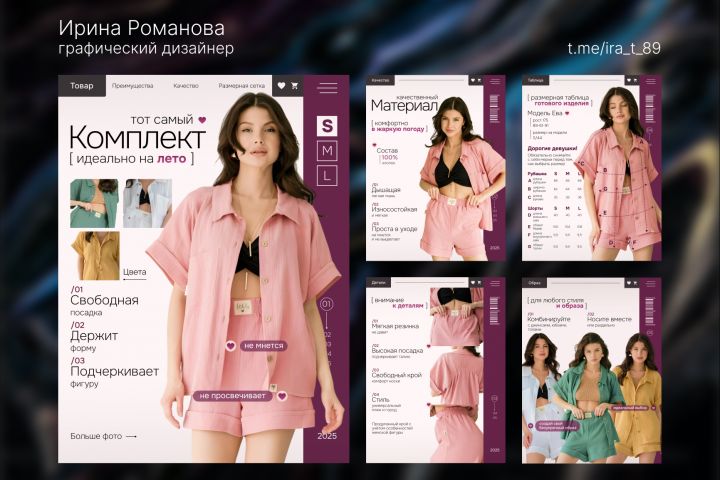 Дизайн карточки товара в едином минималистичном стиле для женского летнего костюма, представленном в 3 цветах.