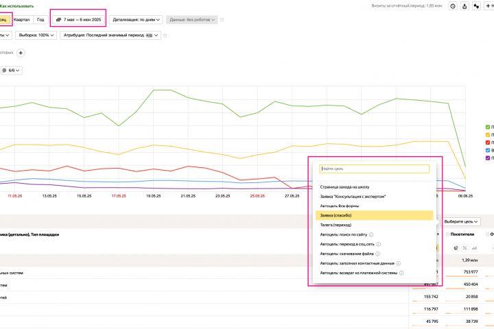 Настройка всех целей, информация по всем источникам и конверсиям в удобном отображении