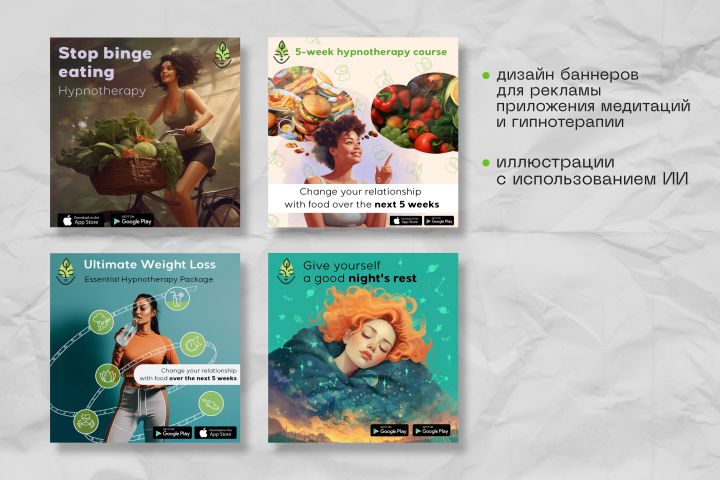 Дизайн креативов для рекламы приложения медитаций и гипнотерапии. Иллюстрации выполнены в ИИ и дополнены вручную.