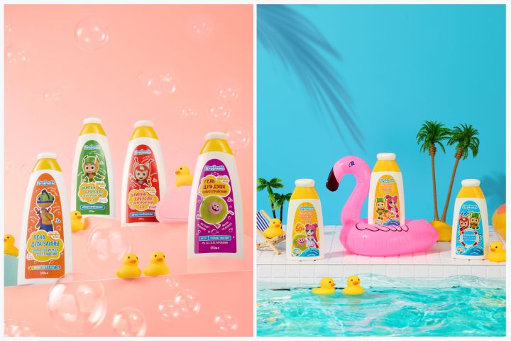 Подготовка: подобрать реквизит (резиновые утята, губки, пенка, пастельные фоны), цветовую палитру и шрифтовые зоны для текста.