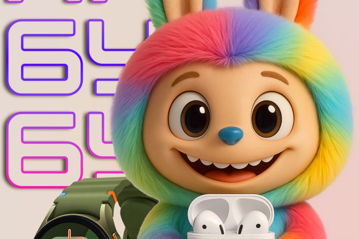 Отрисовка трендовой милой игрушки лабубу, котороя держит в лапах призы( наушники и часы)