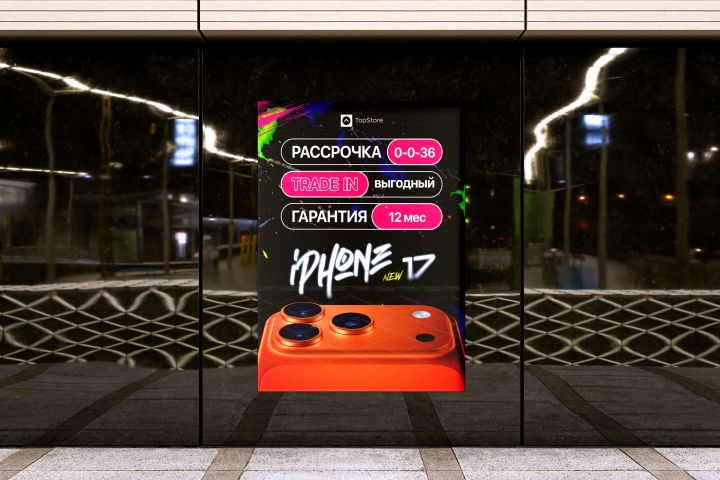 Баннер для торгового центра, необходимо изобразить новый iPhone 17 и написать условия магазина- рассрочка, гарантия и выгодная система Trade in
