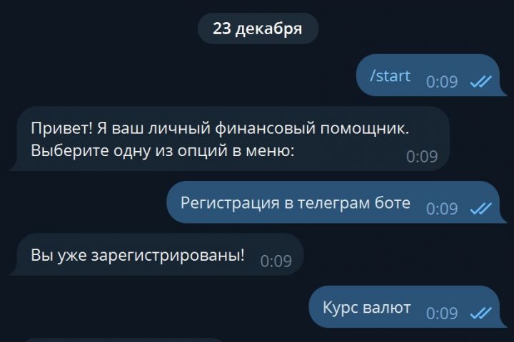 • Библиотеки: aiogram (для работы с Telegram API), sqlite3 (для хранения данных), requests (для запросов к API курсов валют).